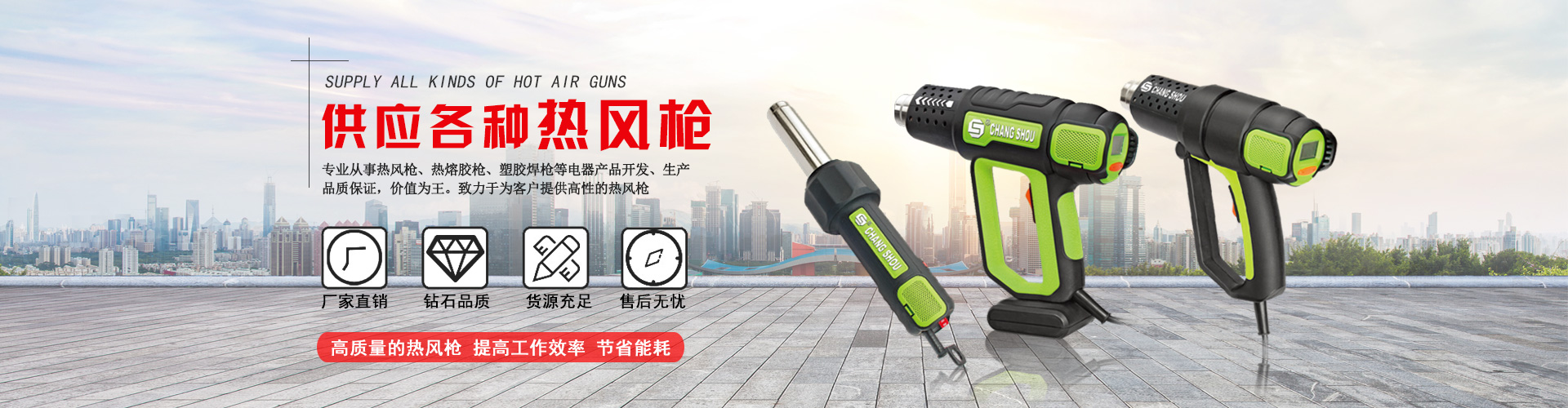 本廠 始建于1994年, 擁有塑膠件注塑生產(chǎn)加工、發(fā)熱芯生產(chǎn)線、成品裝配線,是從事電熱工具:熱風(fēng)槍、熱熔膠槍、塑膠焊槍等電器產(chǎn)品開發(fā)、生產(chǎn)的專業(yè)廠家,擁有二十多年的生產(chǎn)經(jīng)驗(yàn),其中工業(yè)用的調(diào)溫、恒溫、數(shù)字顯示、數(shù)字控制溫度的熱風(fēng)槍、熱熔膠槍已處于國際地位,并獲得多項(xiàng)專利。2000年榮獲《質(zhì)量監(jiān)督檢測中心合格產(chǎn)品》,2002年經(jīng)德國CE認(rèn)證中心認(rèn)證,榮獲CE證書。2003年榮 獲國家輕工部頒發(fā)的《中國名優(yōu)產(chǎn)品》證書,并...